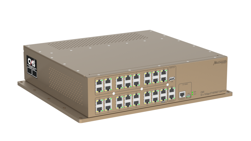 32 Port 10G military grade network switch is the heart of the Empire Audio/Video Distribution System. There are 31 ports which allow 31 individual encoders, decoders, and monitors in any combination of quantities to be switched simultaneously throughout the aircraft.